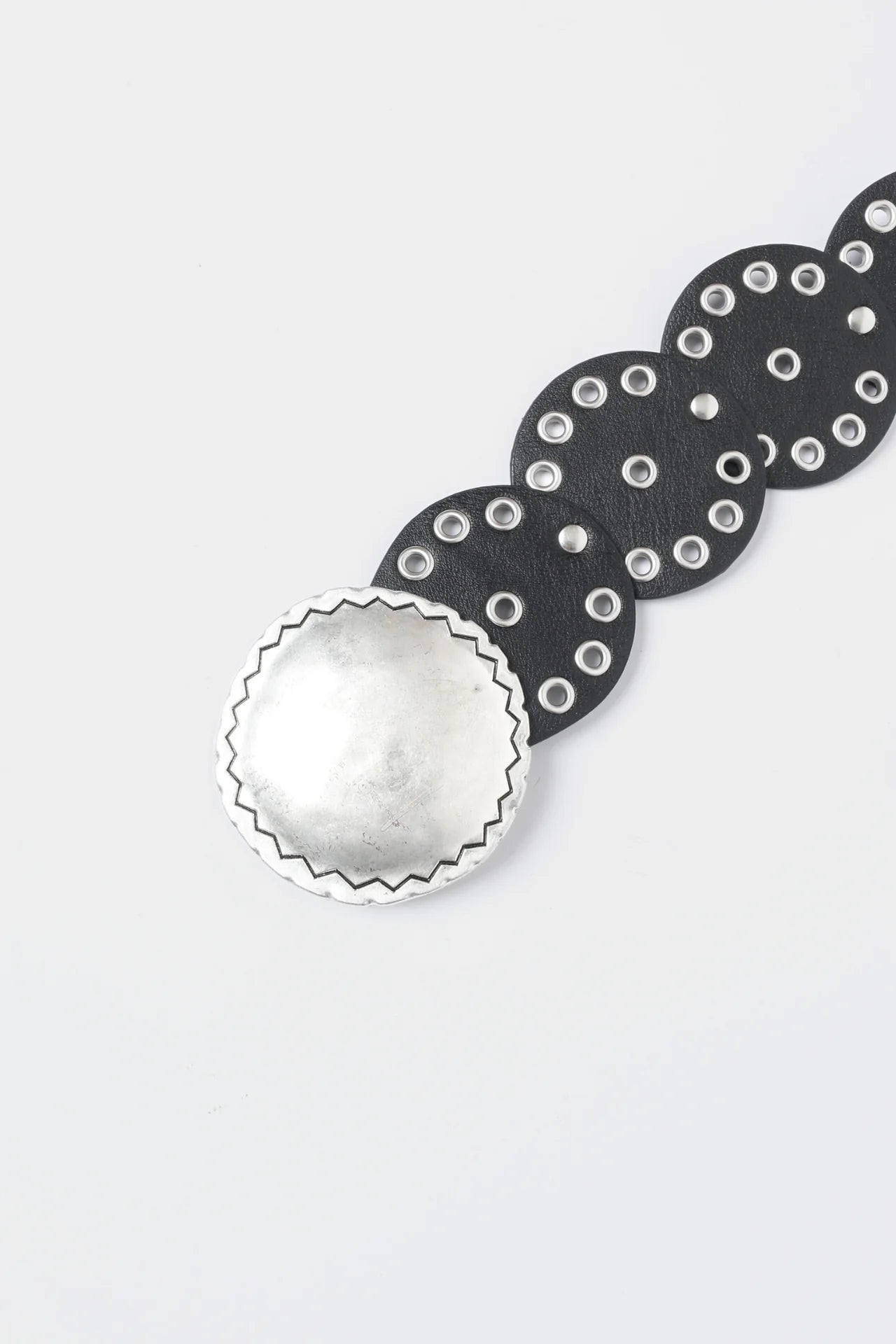 Round metal buckle. Adjustable hook closure. Measurements: 110.0 x 5.0 cm.